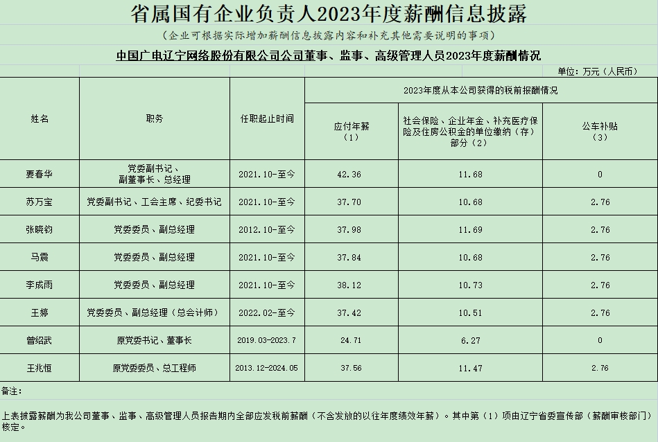 中國廣電遼寧網(wǎng)絡(luò)股份有限公司公司董事、監(jiān)事、高級(jí)管理人員2023年度薪酬情況